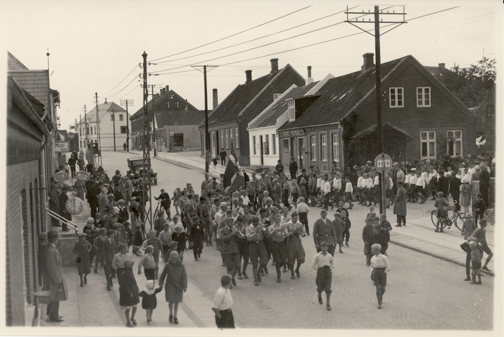 FDF optog med FDF orkester i spidsen på Himmerlandsgade ved Kirketorvet. Billedet er fra midten af 1930'erne. Klik her for helt foto!