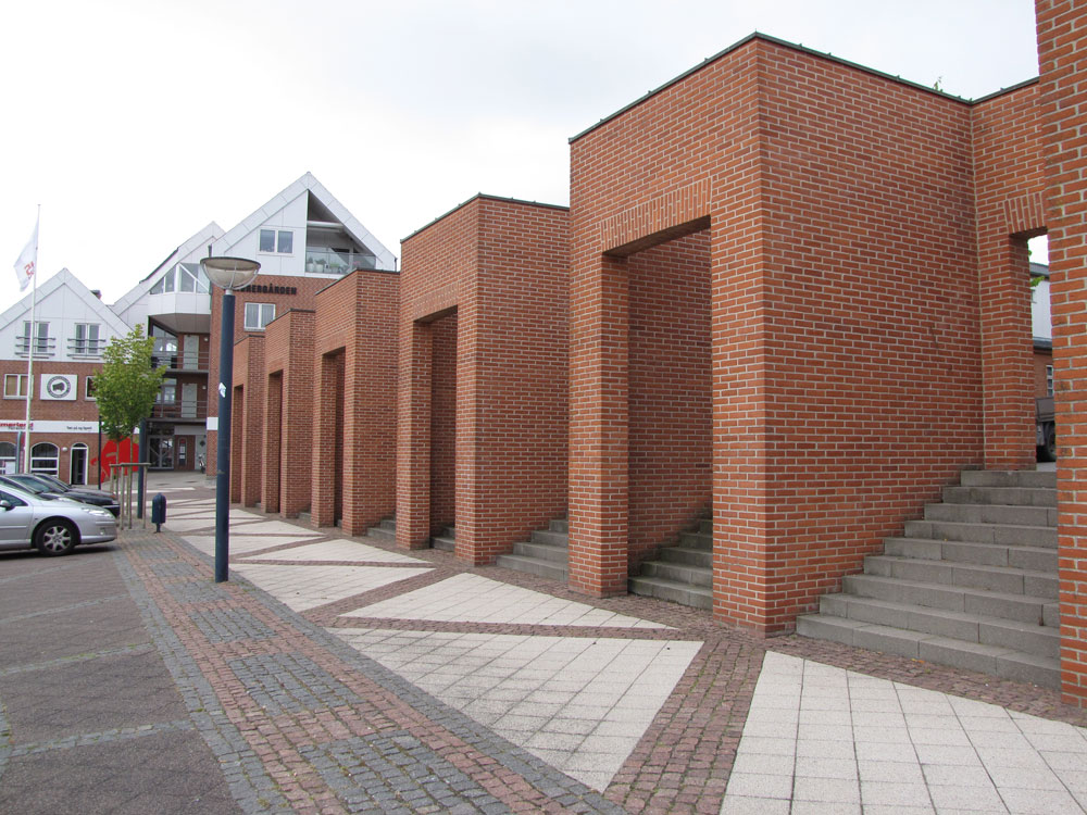 Da torvet blev ny anlagt I 1995, valgte man at bede Per Kirkeby om et forslag til udsmykning. Opgaven var at skabe en skulptur, der ville kunne udjævne niveauforskellen i terrænet og samtidig give stedet et æstetisk løft. Per Kirkeby skabte et skulpturelt værk, der er ind- og udgang på samme tid. Ved indvielsen den 3. juni 1995 sagde kunstneren: " Jeg kan dårligt være bekendt at udbrede mig om min fascination af ornamentet. Muren er jo et stort ornament. Kan jeg nævne, at ornamentet er både et billede på livet og en måde at klare livet? Et billede, fordi ornamentet er alle smertepunkterne bragt i en form. Der er evigt gentagende og endeløs. Et overlevelsesmiddel, netop fordi det er bragt i en form."