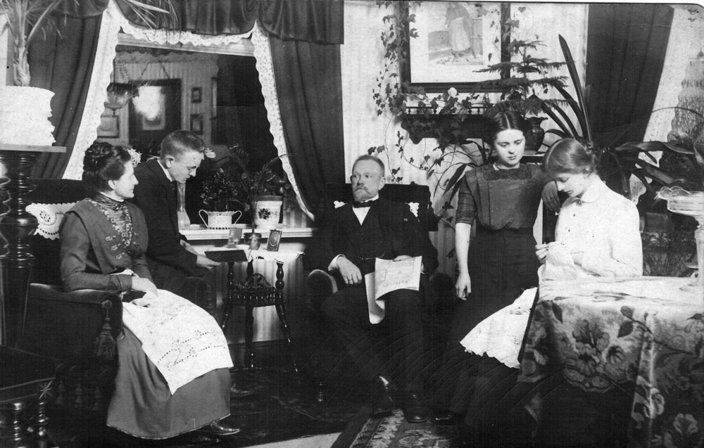 Købmand C. Christensens stue fotograferet i 1914. Fra venstre ses fru. Christensen, sønnen Ruby, købmand Christensen og døtrene Inger og Cathrine. Klik her for helt foto!