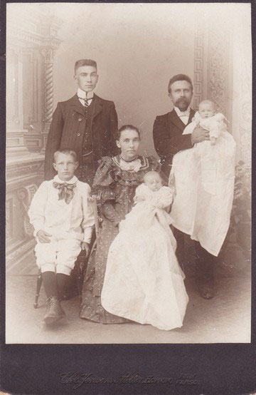 Morten Nielsen og hustru Anne Margrethe Marie Hansen fotograferet sammen med sønnen Hans Peder (H.P.) født 19. august 1889, Asmus født 18. november 1896 og tvillingerne Martha og Louise født 28. marts 1907. Klik her for helt foto!