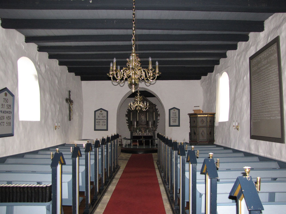Kirken er, efter dens opførelse, blevet ombygget og tilbygget. Blandt andet er den blevet forlænget mod vest, på et tidspunkt i senmiddelalderen. De tykke mure indikerer, at det formentlig har været tanken at de skulle bære et tårn. I stedet for et tårn blev der opført en klokkestabel på kirkens vestvendte gavl, med en klokke fra 1684. Døbefonten er romansk stil og udført i granit. Dåbsfadet er fra Nürnberg, og fremstillet i perioden omkring 1550. Prædikestolen er fra 1576, og den lidt nyere altertavle er fra starten af 1600 tallet.