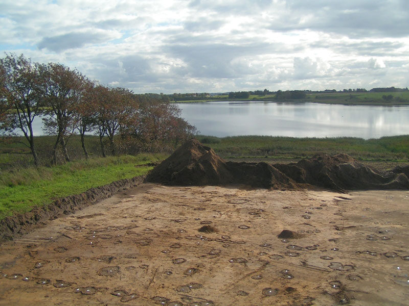 Udgravningsfelt med bebyggelsesspor. I baggrunden Louns Sø. Klik her for helt foto!