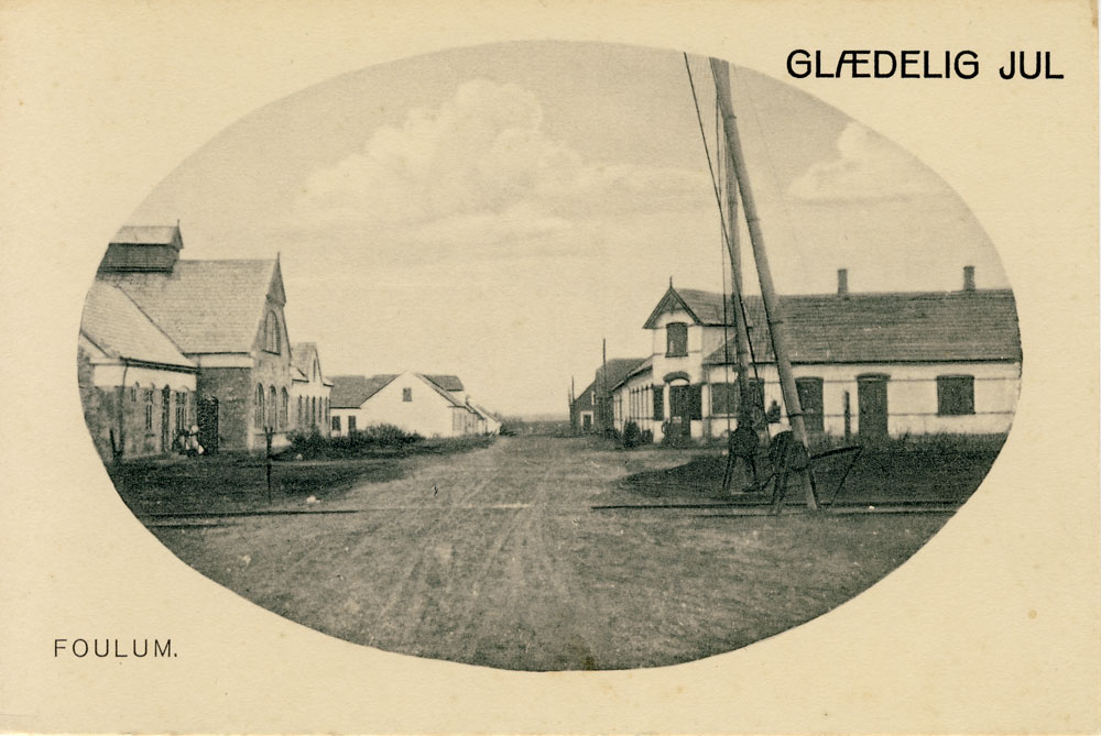 Foulumvej set ind mod Ullits. Til venstre ses mejeriet og til højre ses købmandsgården. Billedet er nok fra 1920'erne. Klik her for helt foto!